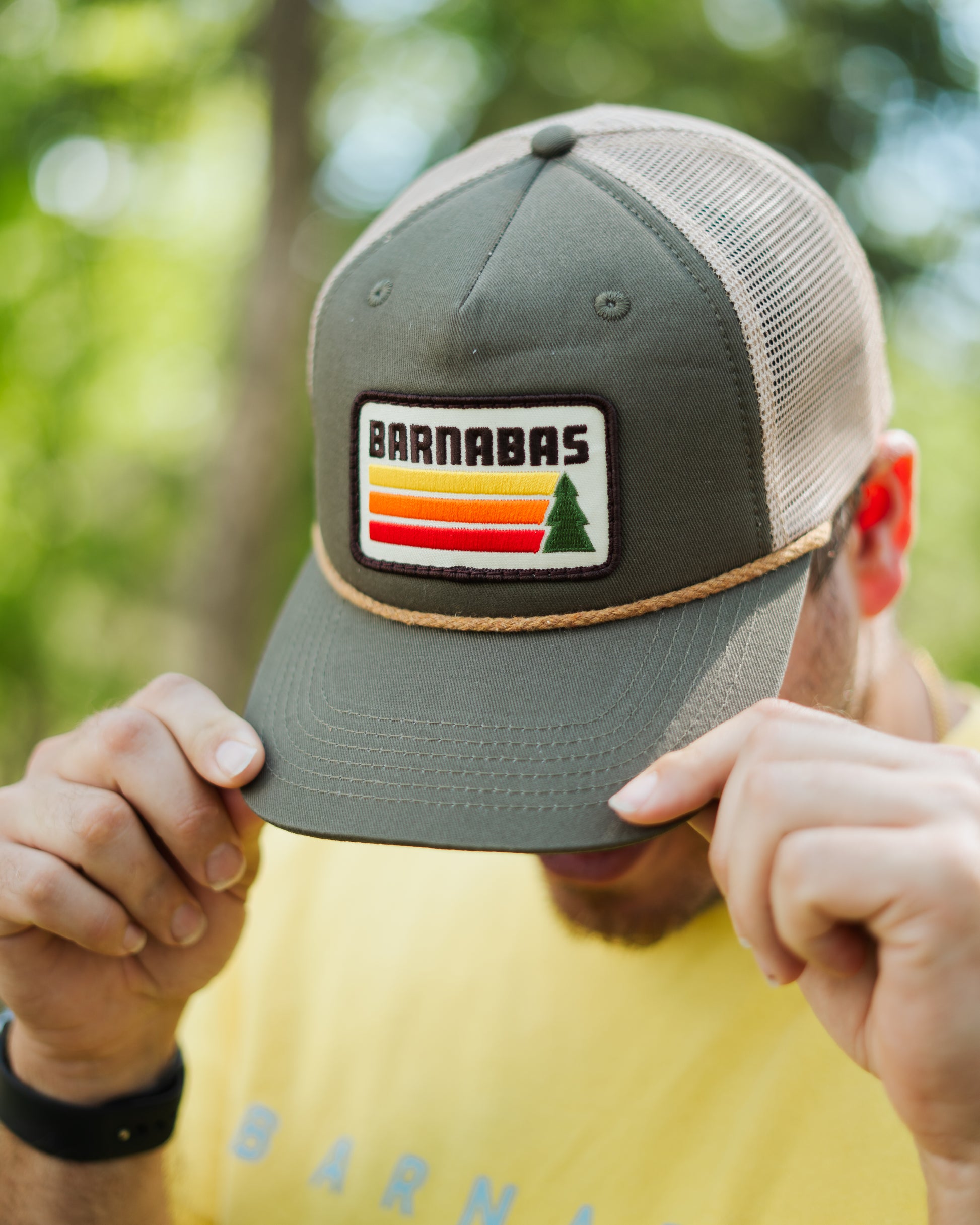 Top off your look with our Ranchero rope trucker hat in Gator and Balsa, featuring a custom Barnabas sunset patch. With its breathable mesh back and classic fit, this hat is perfect for sunny days at camp or everyday wear. Show off your Barnabas spirit in style!